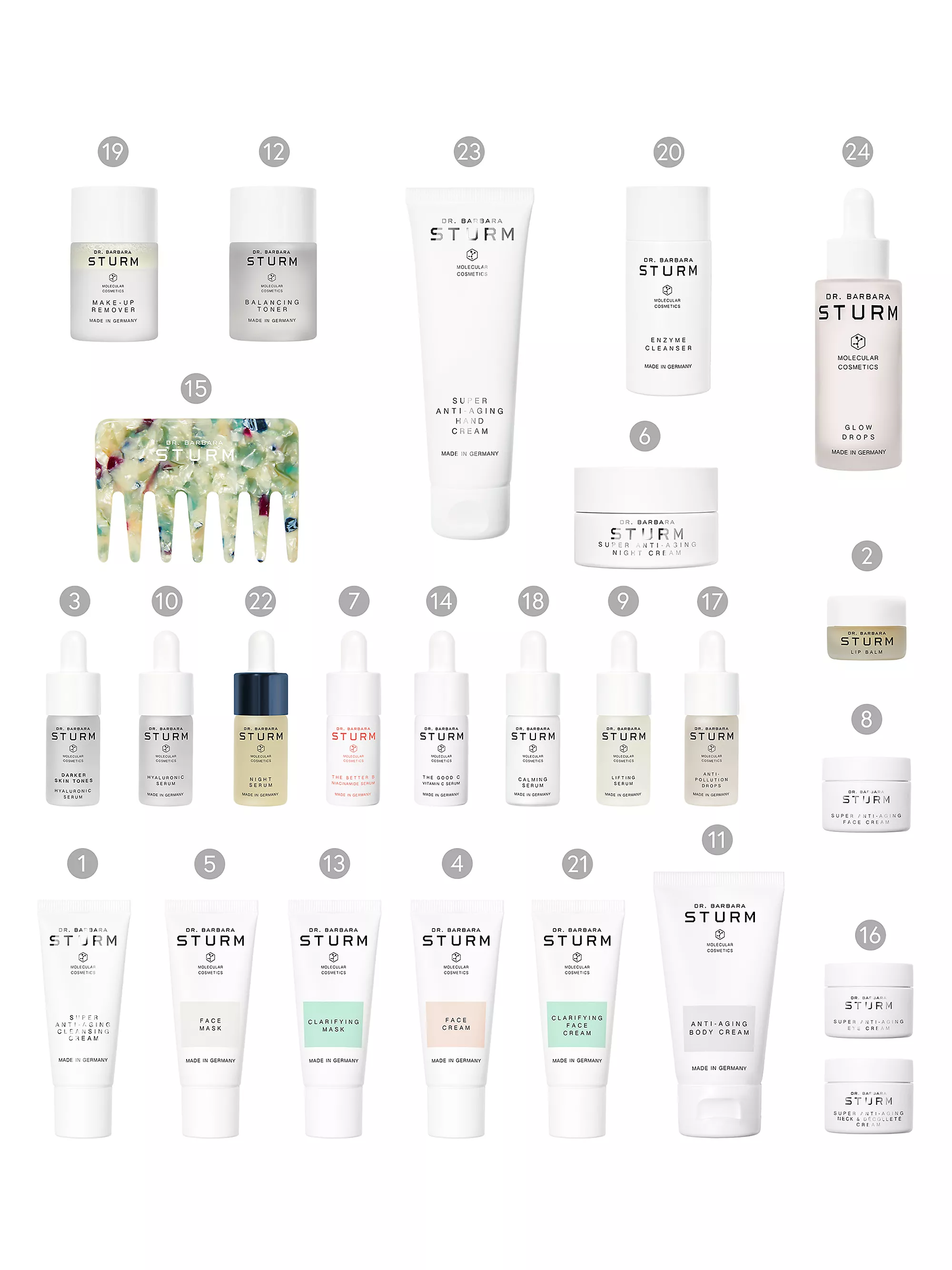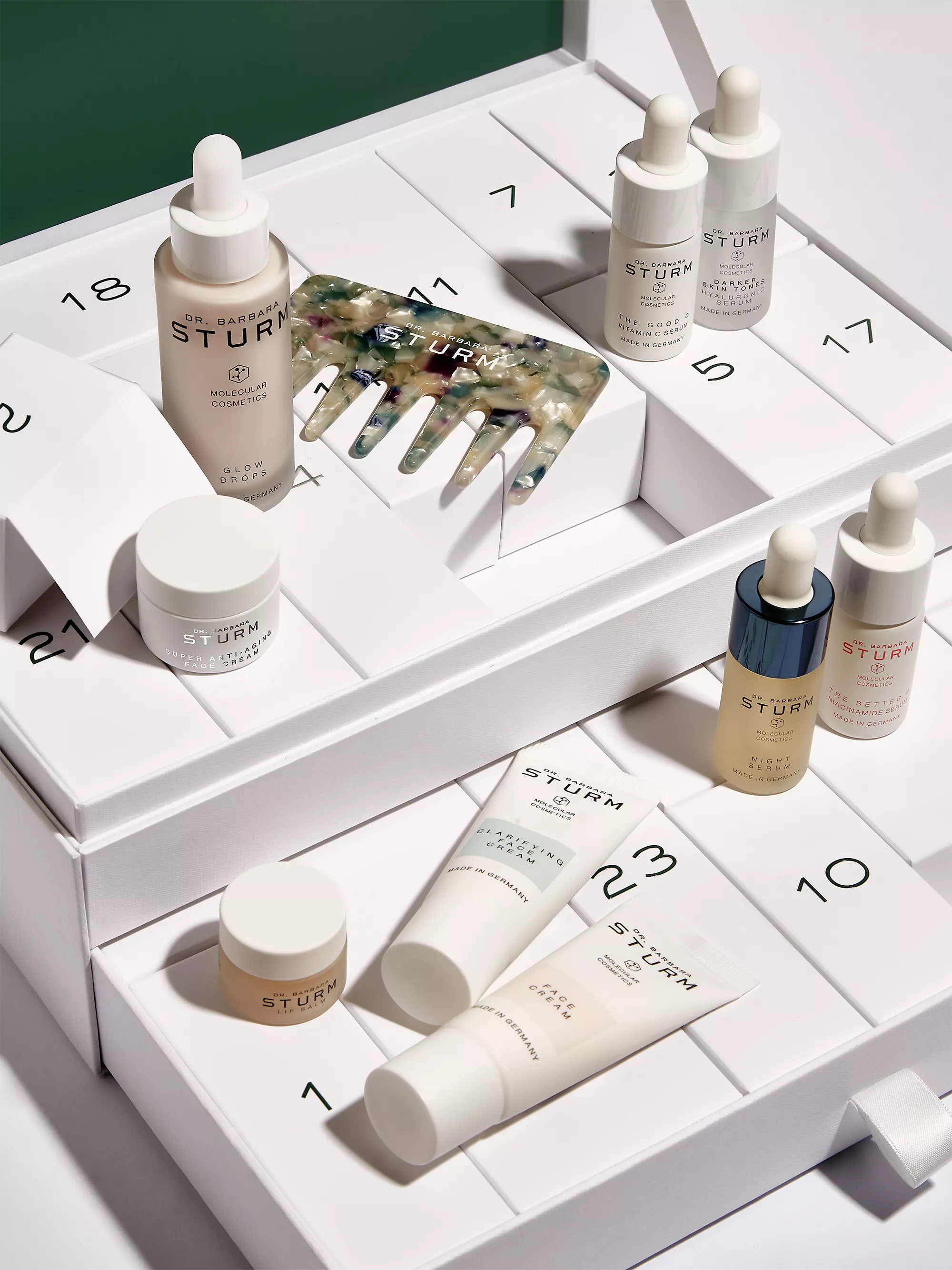 Este Calendario de Adviento presenta una selección de los productos más queridos de la Dra. Sturm, así como sus últimas innovaciones. Reimaginado para 2023, el calendario de este año se encuentra dentro de una hermosa caja de regalo inspirada en un armario de joyería que se abre para revelar dos niveles, cada uno de los cuales contiene sorpresas para el cuidado de la piel numeradas individualmente para los 24 días previos a la Navidad. Presenta una selección de los productos más queridos de la Dra. Sturm, así como sus últimas innovaciones, en tamaños completo, de lujo y miniatura, y es el regalo perfecto para las fiestas. Hecho en Alemania.