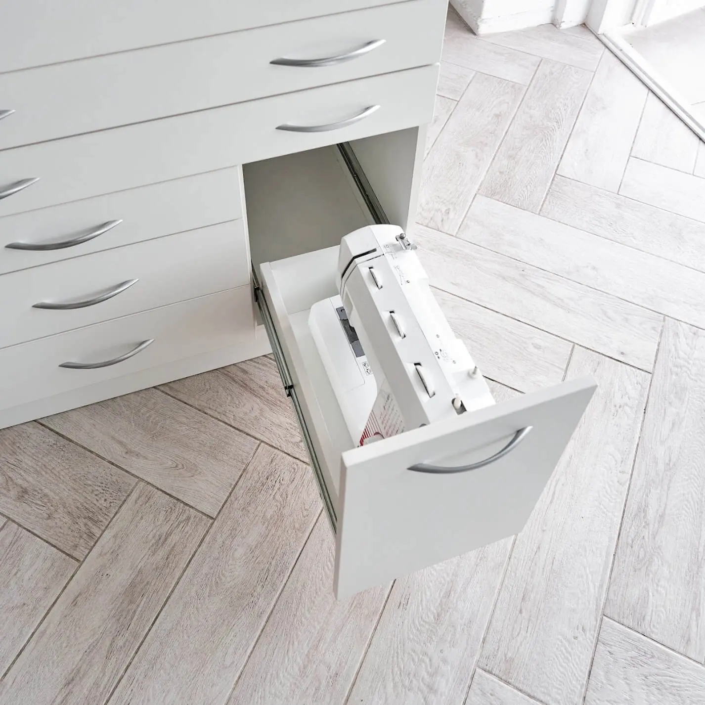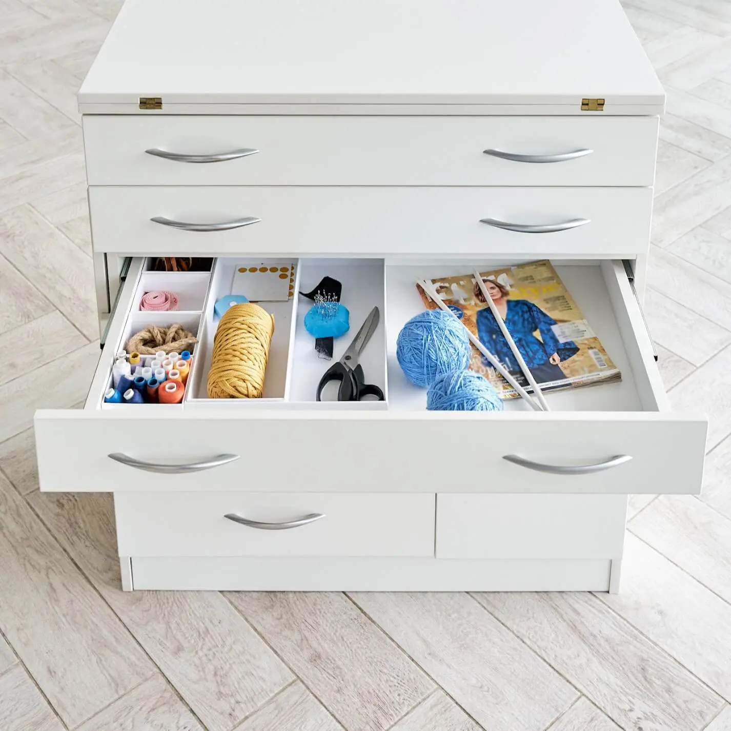Una cómoda común esconde muchas cosas útiles: cajones para máquinas de coser, tablas de planchar, cajones para botones y varias piezas pequeñas, estantes plegables para cortar.