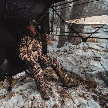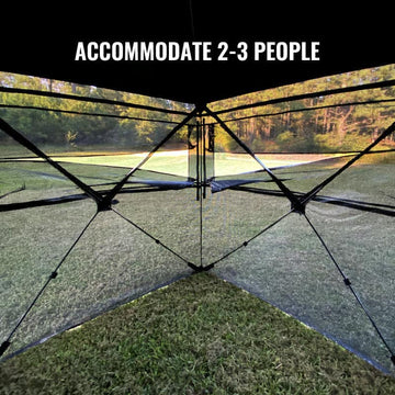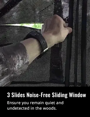 La persiana para 3-4 personas ofrece un amplio espacio interior con una altura de 80 pulgadas y un área de piso que mide 70" x 70". Permite caminar erguidos y tiene capacidad para 4 personas, lo que lo hace más cómodo durante su viaje de caza.