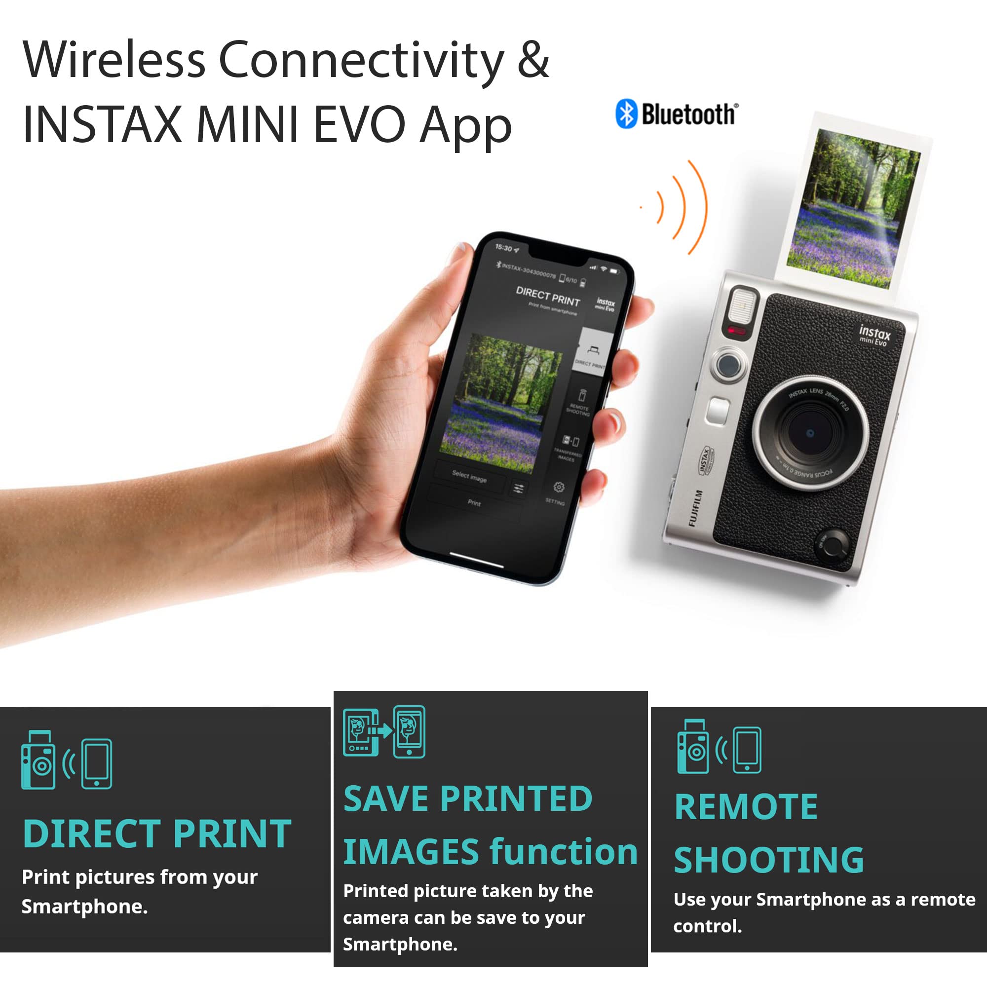 - Tómalo con calma: ¡Descargue la aplicación gratuita INSTAX MINI EVO y seleccione su imagen Smartphone! Entonces, ¿qué estás esperando? Recorte, gira, modifica el brillo, el contraste y la saturación, agrega un filtro, elige y carga tu película instantánea INSTAX MINI y luego imprime tu foto en la cámara INSTAX MINI EVO directamente desde tu Smartphone.