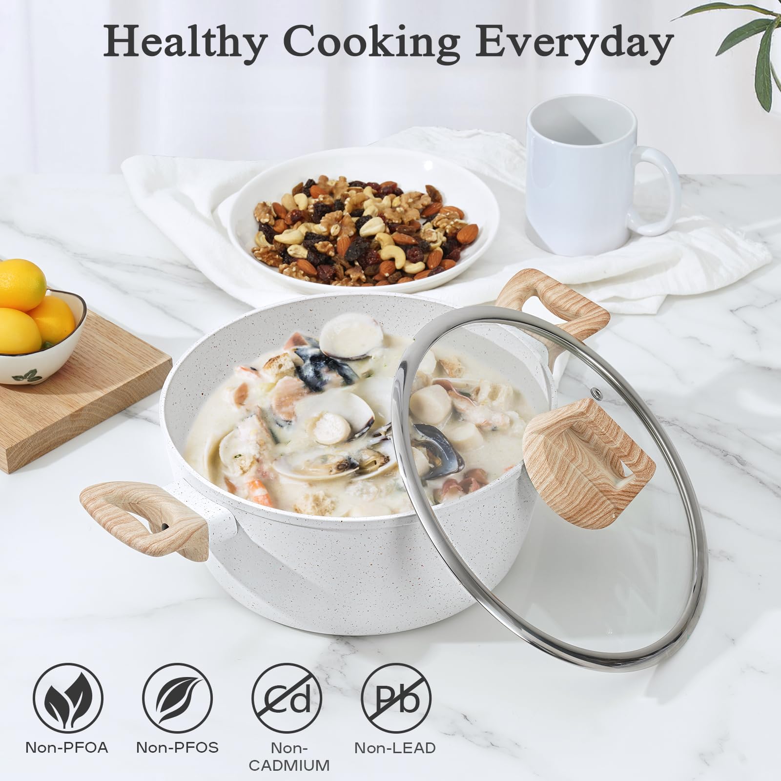 Este revestimiento de granito antiadherente ayuda a reducir la cantidad de aceite o mantequilla necesaria para cocinar, lo que da como resultado comidas más saludables.