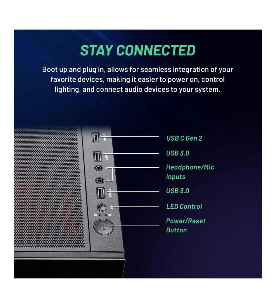 802.11 CA | Sin software de relleno | Las opciones de salida gráfica incluyen 1 x HDMI y 1 x Display Port Garantizado, los puertos adicionales pueden variar | Puertos USB que incluyen puertos 2.0, 3.0 y 3.2 Gen1 | Audio HD y micrófono | Teclado y mouse para juegos gratuitos.