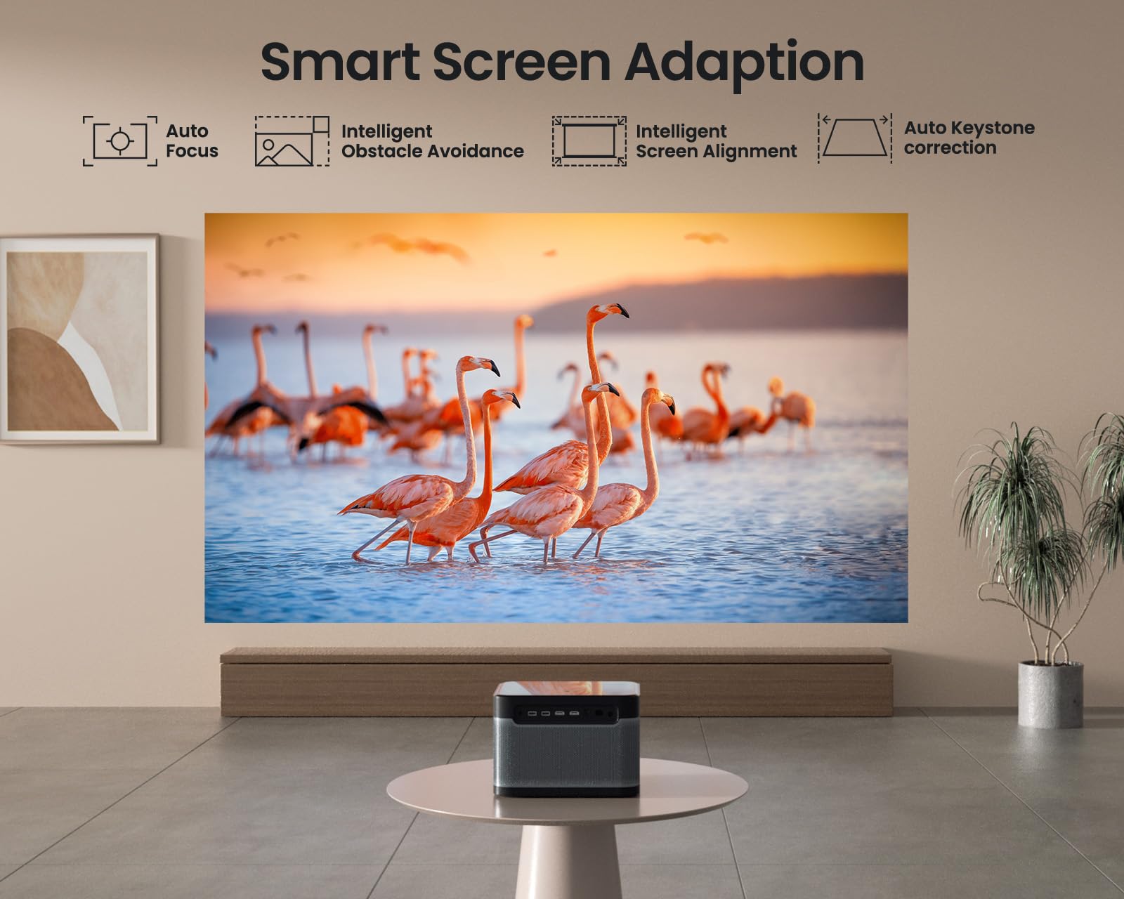 - Ajuste de pantalla inteligente: enfoque automático, corrección trapezoidal automática de ±40 grados, evitación inteligente de obstáculos y alineación inteligente de la pantalla. Sin restricciones de espacio, puede ajustar rápidamente la configuración por sí mismo.