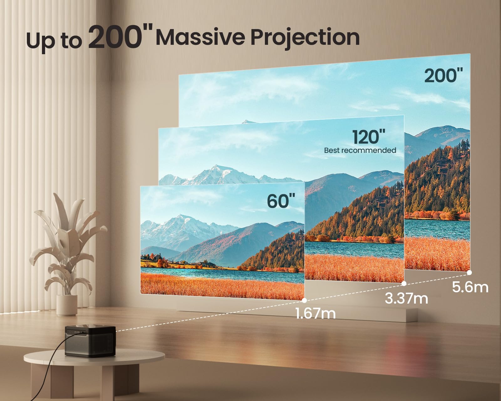 - Pantalla perfecta, tamaño perfecto: experimente un tamaño de proyección más grande que la vida útil de hasta 180 pulgadas. Sumérgete en la viveza del soporte HDR10 y HLG, asegurando colores vibrantes y realistas según lo previsto por los cineastas. Con el ajuste de brillo AI, su experiencia visual se adapta perfectamente a cualquier entorno de iluminación. ¡Es hora de traer el teatro a casa!