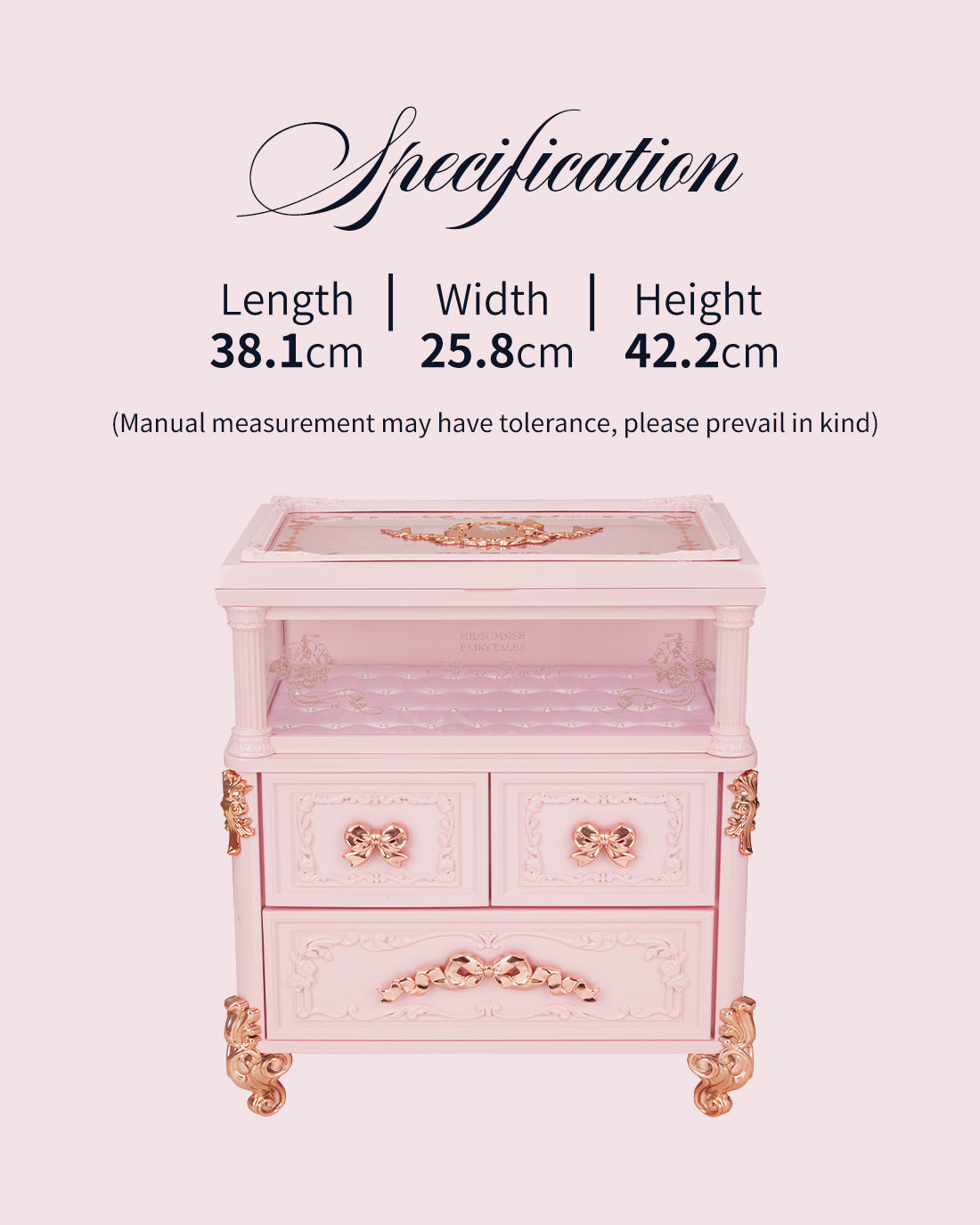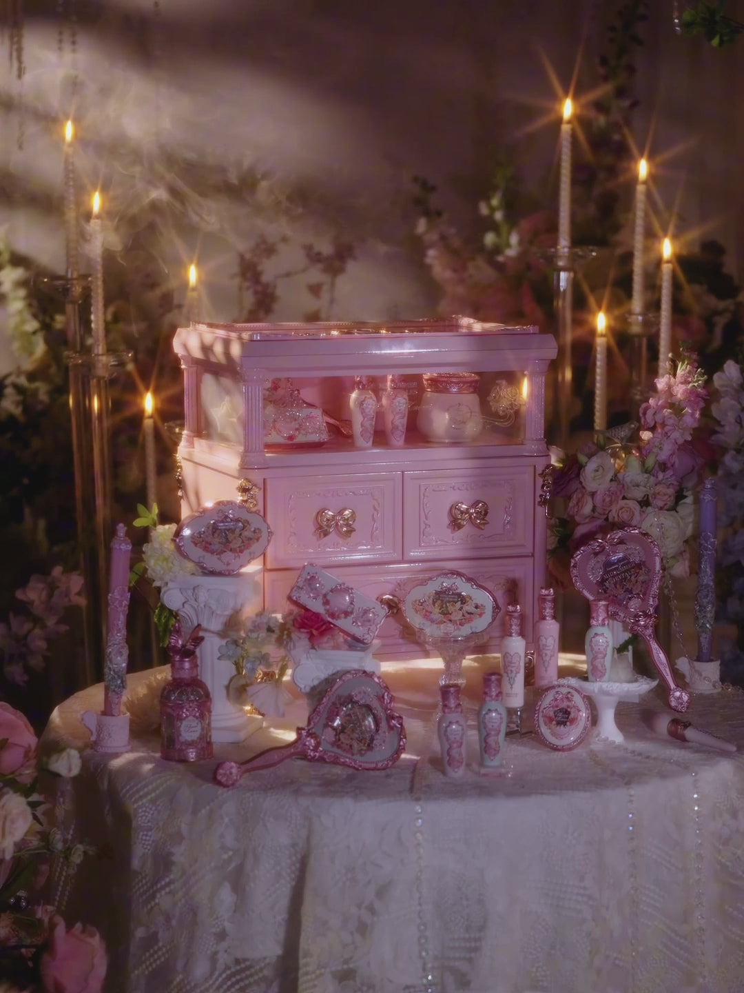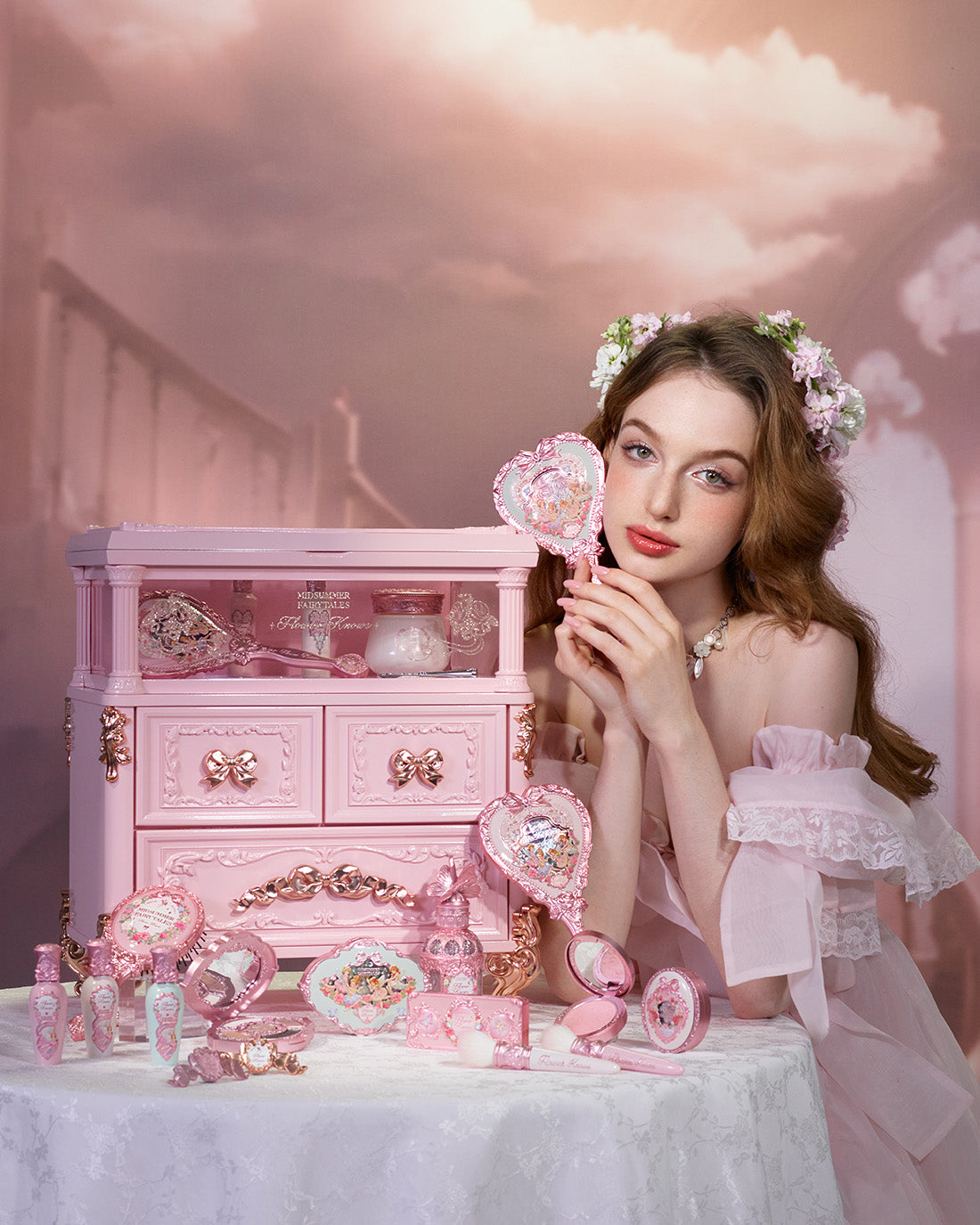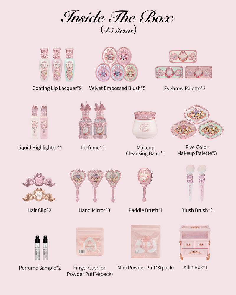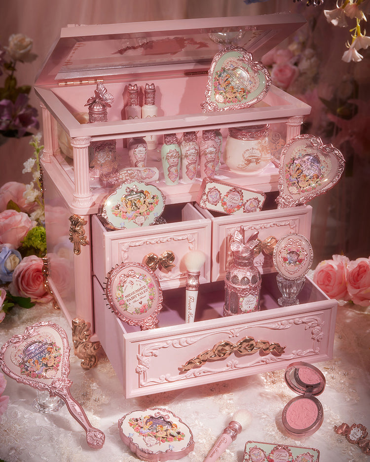 Inspirada en la arquitectura palaciega clásica, la caja de regalo todo incluido de la colección Midsummer Fairytale se asemeja a un gabinete de maquillaje y un tocador en miniatura. Con suaves tonos rosados, cierres en forma de corazón y relieves de hadas, es perfecto para uso personal o para regalar.