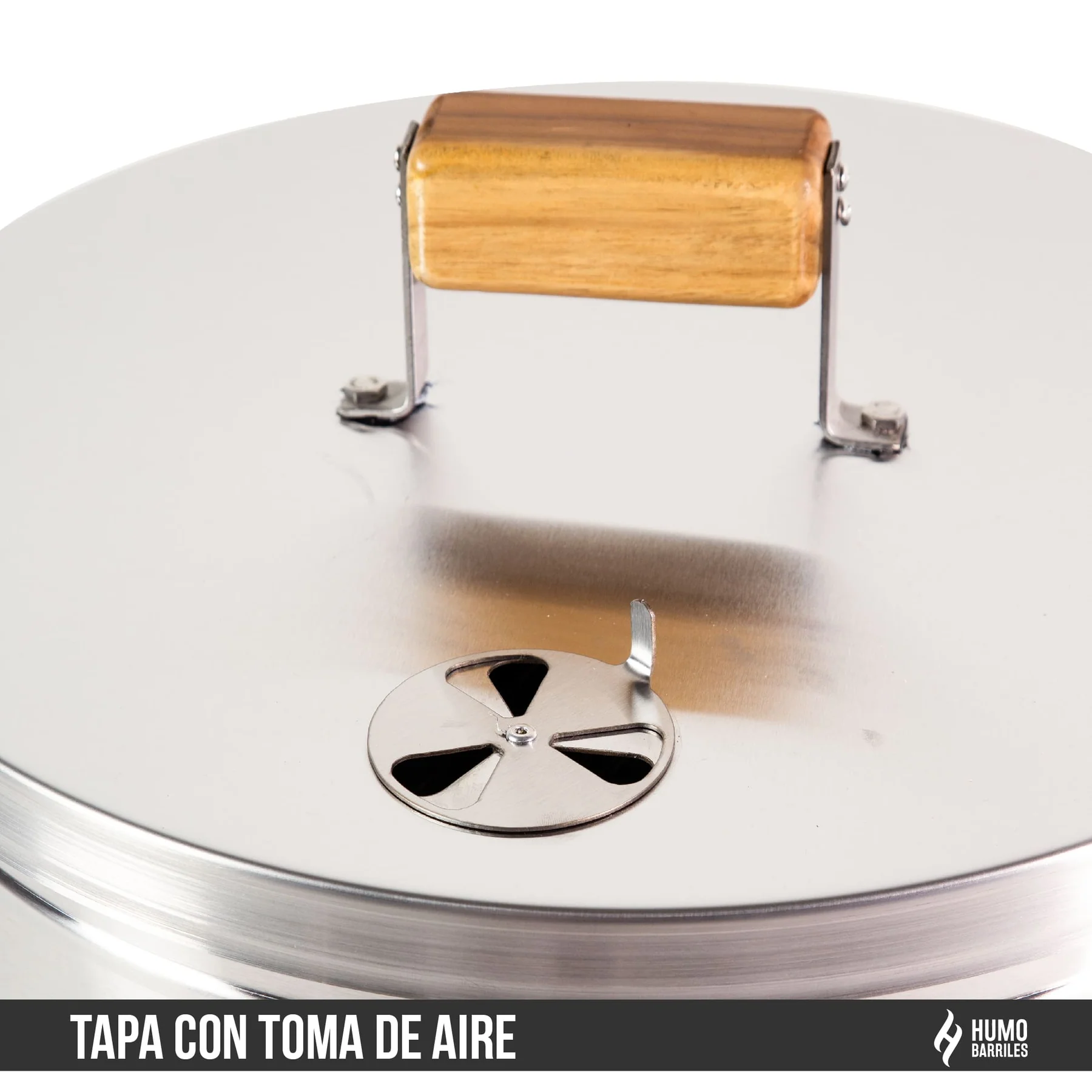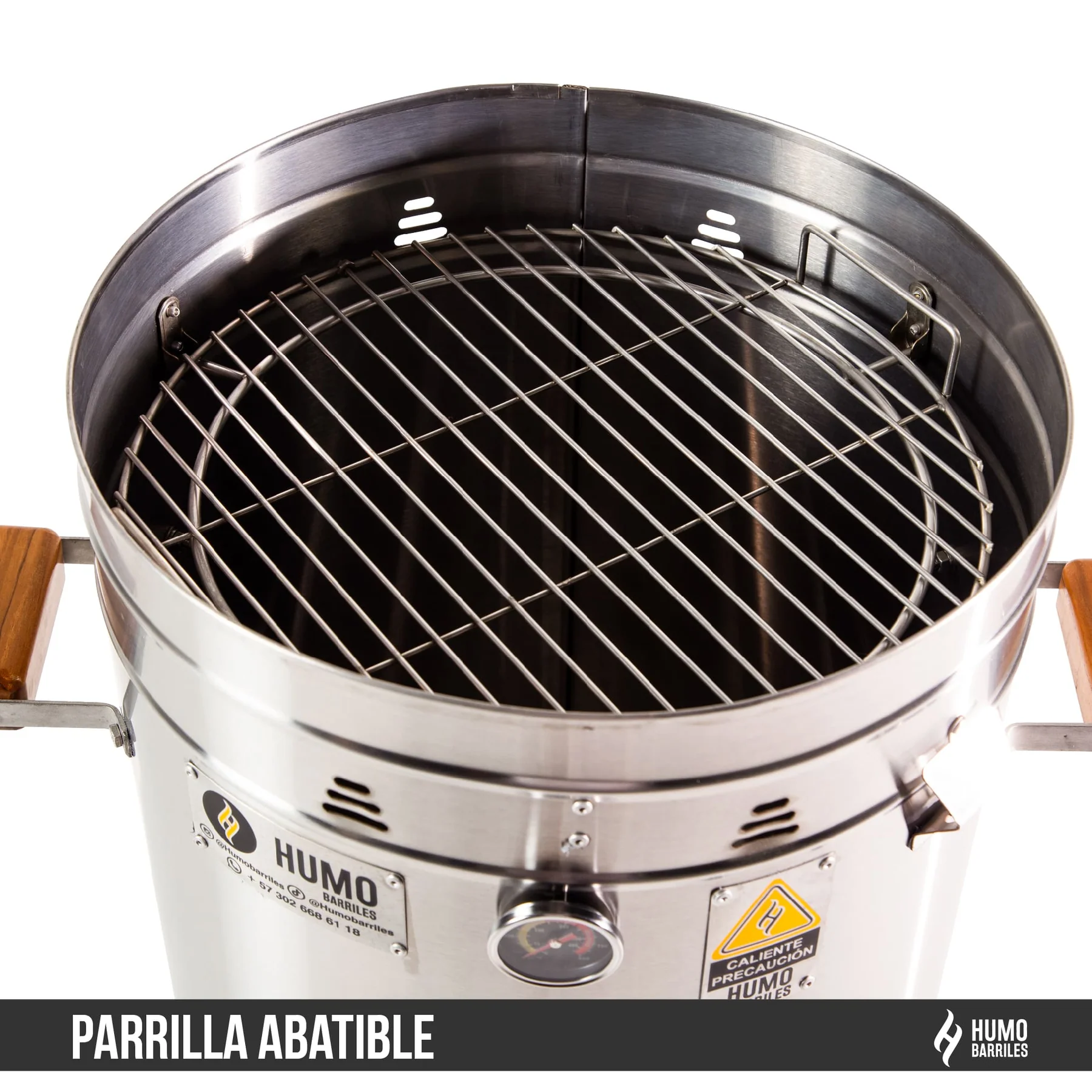 El barril está elaborado en lámina de acero inoxidable, esto hace que el calor se distribuya de manera uniforme por toda su superficie haciendo que tus asados queden cocinados de manera uniforme, además, tiene tres mangos en madera ”teca” para evitar quemaduras mientras estás en tus asados y te facilita su transporte.