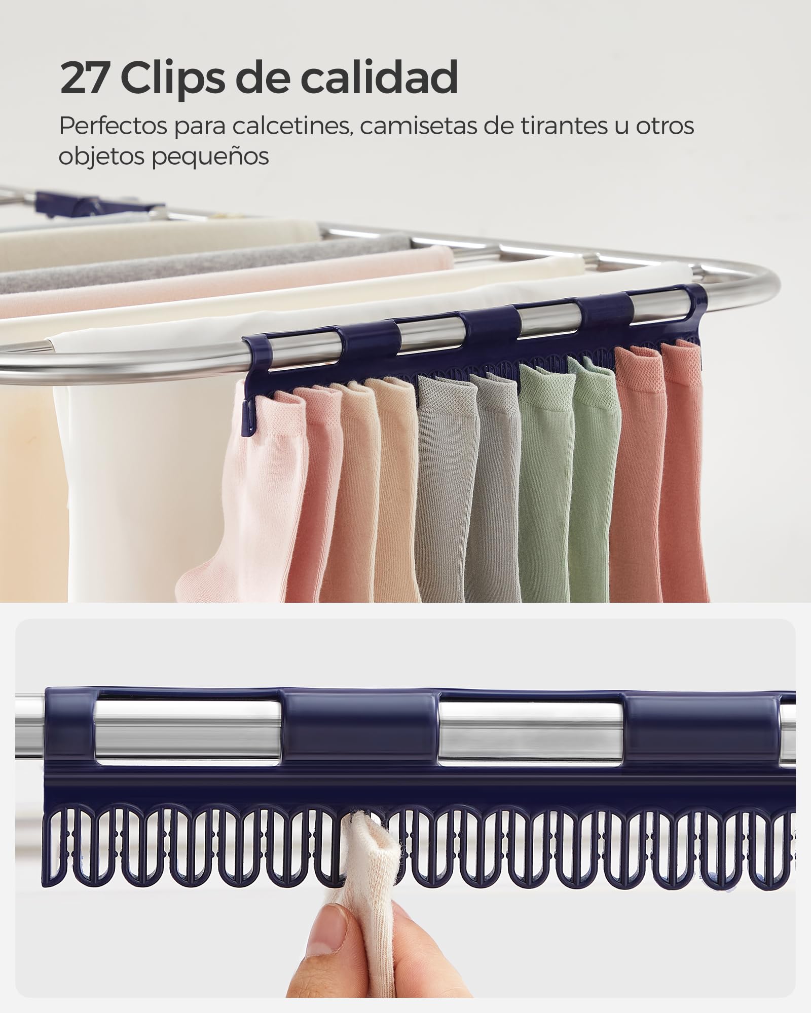 Se proporcionan 27 clips para colgar calcetines, ropa interior y otros accesorios.