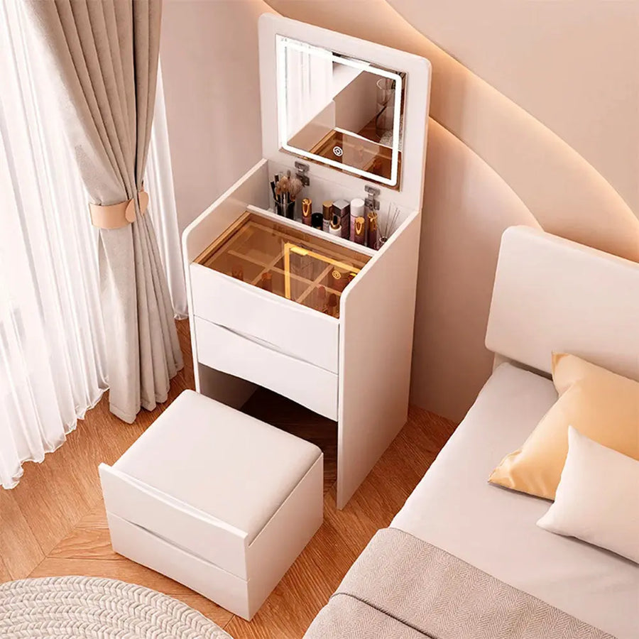- Diseño moderno y elegante: el tocador tiene propiedades de doble propósito. Cuando está abierto, se puede utilizar como tocador. Cuando está cerrado, puede servir como escritorio. Puede colocar una computadora sobre la mesa para realizar asuntos oficiales. Además, la mesa de maquillaje combina con varias escenas debido a su diseño elegante y estilo minimalista. No solo es adecuado para el dormitorio, sino también para la sala de estar o la casa de estudio. Esquinas curvas anticolisión, elegantes y seguras.